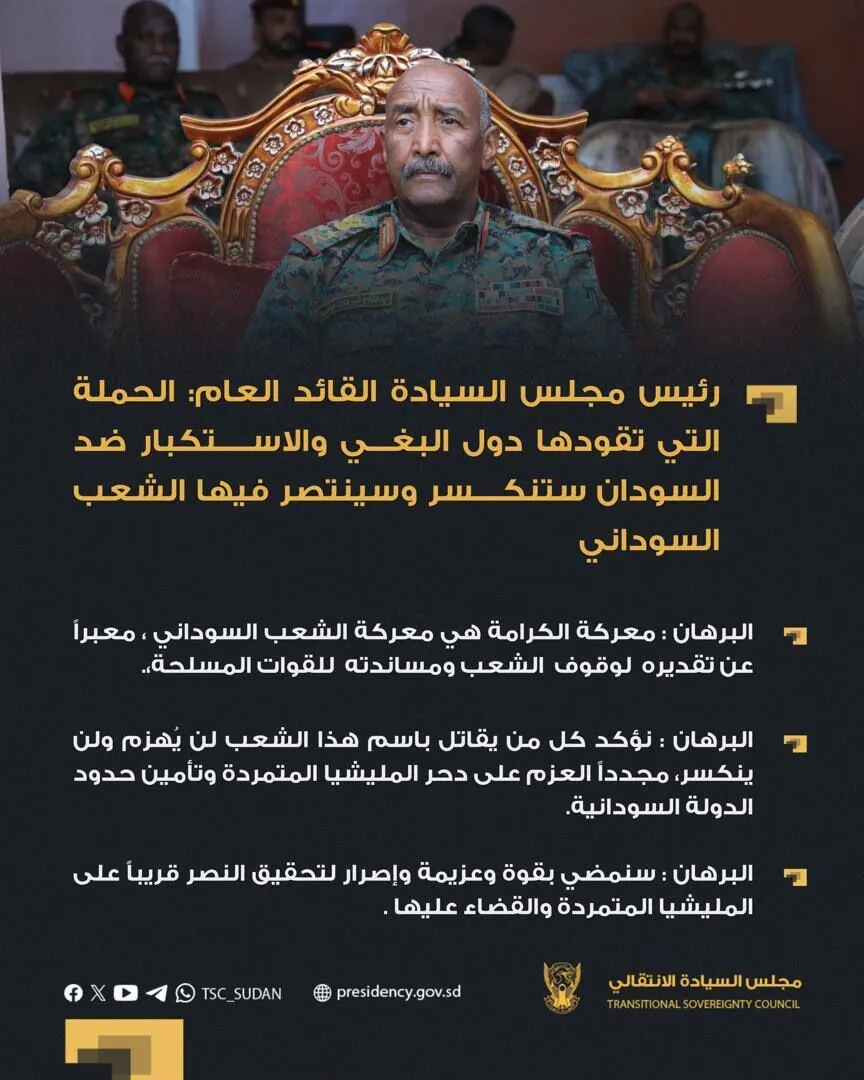 أكد السيد رئيس مجلس السيادة القائد العام للقوات المسلحة الفريق أول الركن عبدالفتاح البرهان ، أن الحملة التي تقودها دول البغي والاستكبار ضد السودان ستنكسر، وسينتصر فيها الشعب السوداني.