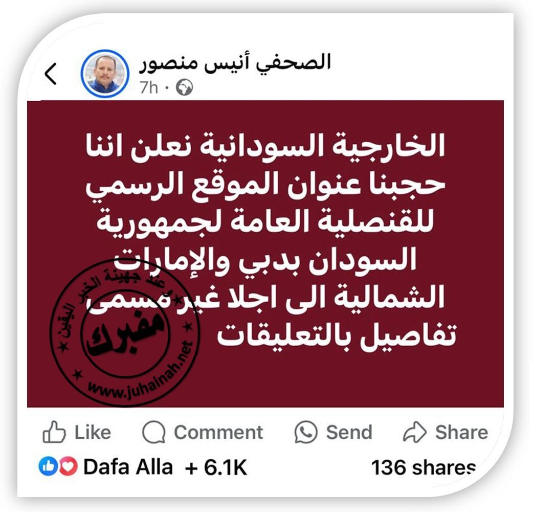 تناقلت العديد من الحسابات في مواقع التواصل الاجتماعي خبراً مفاده أن سفير السودان بدولة الإمارات السيد عبدالرحمن شرفي أعلن عن رفضه لقرار مجلس الأمن والدفاع بقطع العلاقات الدبلوماسية بين السودان والإمارات بحجة أنه صادر من جهة غير مختصة.