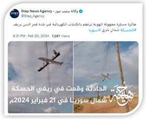 وقد نشر في صفحة تلفزيون سوريا بالفيسبوك بتاريخ 21 فبراير 2024م وهو لطائرة مسيّرة حربية مجهولة علقت في خطوط الهاتف شرقي سوريا حسب ما ذكر التلفزيون.