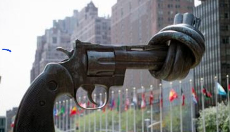 منحوتة ‘اللاعنف’ (المسدس المعقود)، تمثال لكارل فريدريك رويترزوارد، بمقر الأمم المتحدة في نيويورك