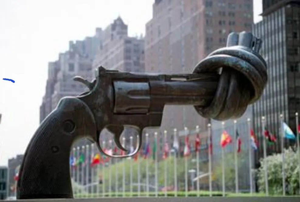 منحوتة 'اللاعنف' (المسدس المعقود)، تمثال لكارل فريدريك رويترزوارد، بمقر الأمم المتحدة في نيويورك