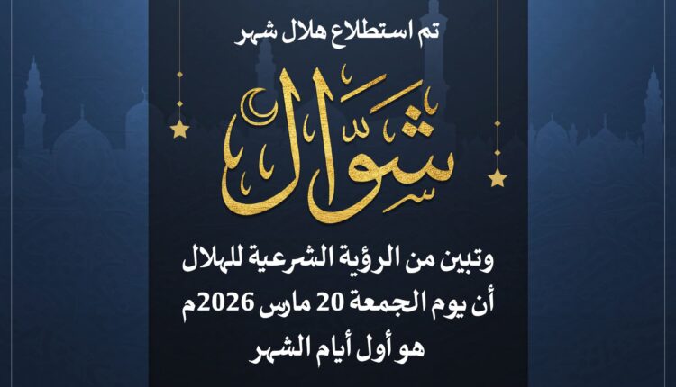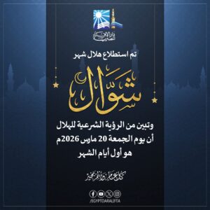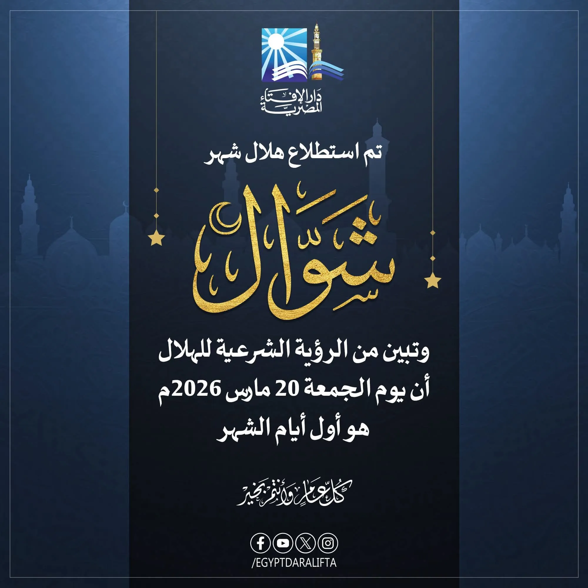 وعلى ذلك تُعلن دارُ الإفتاءِ المصريةُ أن يومَ الجمعة الموافق العشرين من شهر مارس لعام ألفين وستة وعشرين ميلاديًّا هو أول أيام شهر شوال لعام ألفٍ وأربعمائةٍ وسبعة وأربعين هجريًّا.
