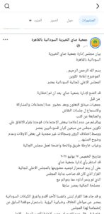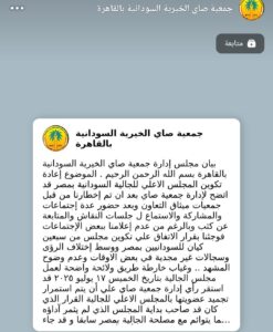 وشددت الجمعية على احترامها لـ “لجنة الحكماء لتوحيد الصف ولم الشمل”، مؤكدة في الوقت ذاته استمرار دورها في تقديم خدماتها لجميع السودانيين في مصر، وفتح أبوابها لكل سبل الخير لأبناء الشعب السوداني العظيم.