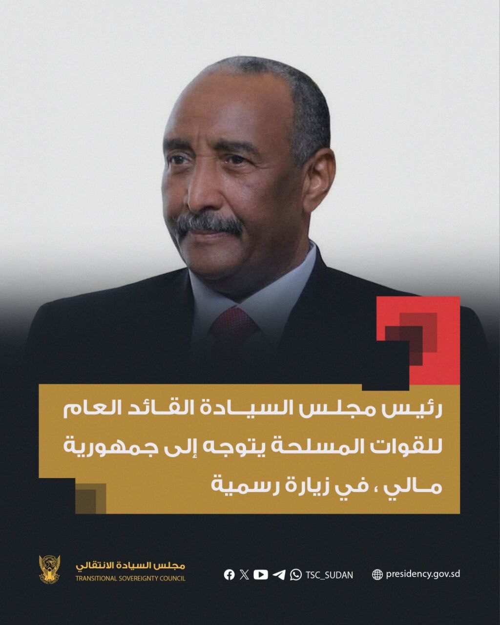 توجه السيد رئيس مجلس السيادة الفريق أول ركن عبد الفتاح البرهان صباح اليوم إلى جمهورية مالي، فى زيارة رسمية.