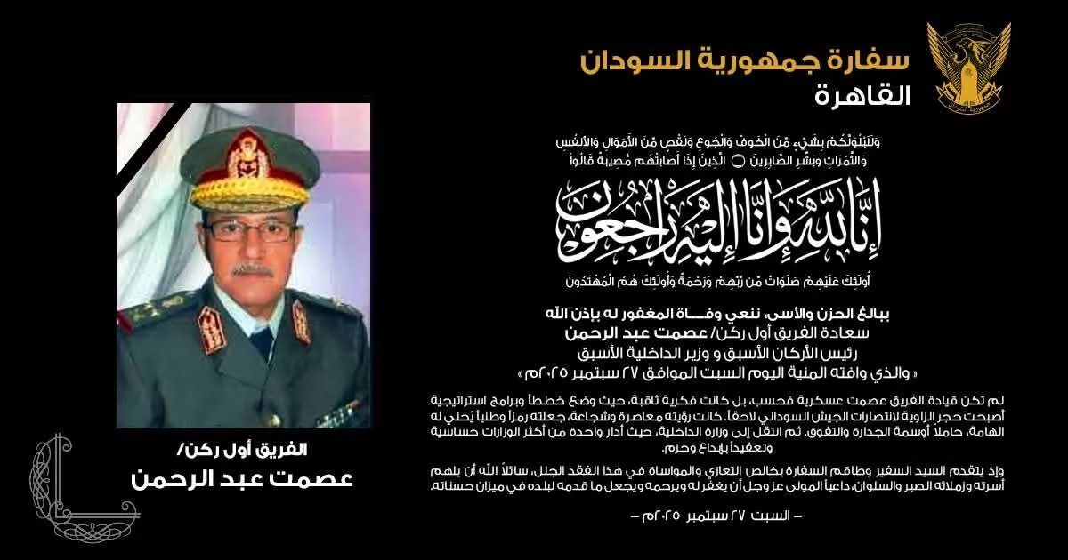 سفارة السودان بالقاهرة تنعي الفريق أول ركن عصمت عبد الرحمن