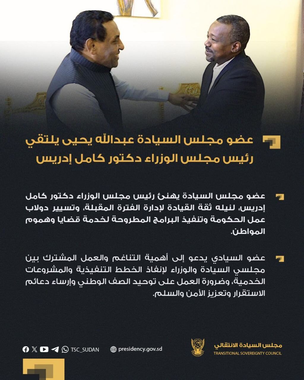 قدم عضو مجلس السيادة الانتقالي دكتور عبدالله يحيى التهنئة للسيد رئيس مجلس الوزراء دكتور كامل إدريس، لنيله ثقة القيادة لإدارة الفترة المقبلة، وتسيير دولاب عمل الحكومة وتنفيذ البرامج المطروحة لخدمة قضايا وهموم المواطن.