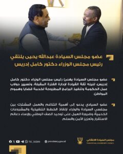 ولفت عضو السيادي لدى، لقائه رئيس مجلس الوزراء، إلى أهمية التناغم والعمل المشترك بين مجلسي السيادة والوزراء لإنفاذ الخطط التنفيذية والمشروعات الخدمية، وضرورة العمل على توحيد الصف الوطني وإرساء دعائم الاستقرار وتعزيز الأمن والسلم.