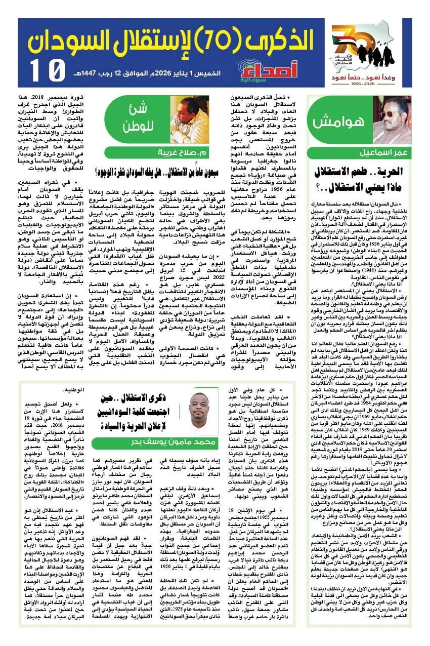 لتصفح صحيفة اصداء سودانية الغدد 481 الصادر في الاول من يناير 2026 ( العدد الخاص باحتفالات ذكرى الاستقلال)، مستخدما تطبيق Google drive، أضغط هنا ………!