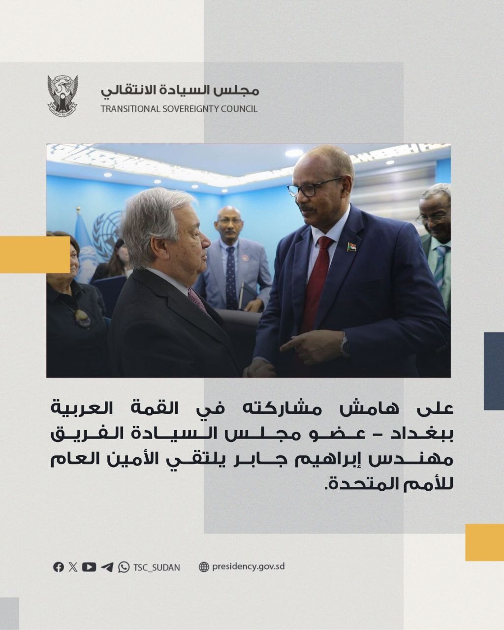 إلتقي عضو مجلس السيادة الانتقالي مساعد القائد العام الفريق مهندس إبراهيم جابر، الامين العام للامم المتحدة أنطونيو غوتيريش بالعاصمة العراقية بغداد التي يزورها للمشاركة في أعمال القمة العربية ببغداد.