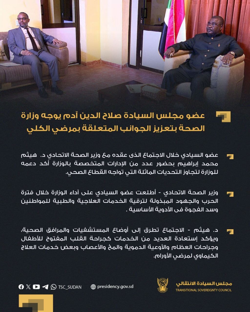 وجه عضو مجلس السيادة الأستاذ صلاح الدين آدم تور وزارة الصحة الاتحادية بضرورة العمل على تعزيز الجوانب المتعلقة بمرضي الكلي والحد من زيادة معدلات الأورام ونقص الأكسجين الطبي.