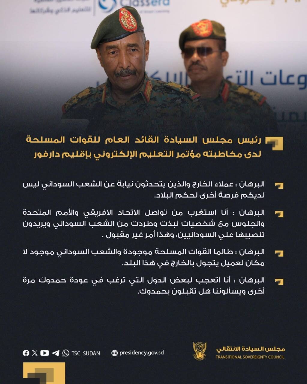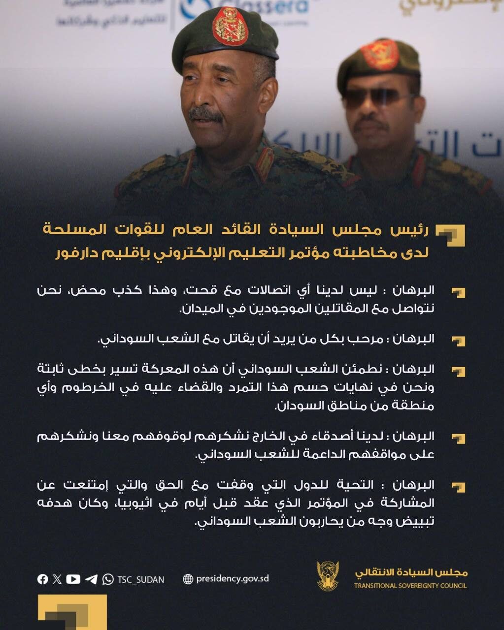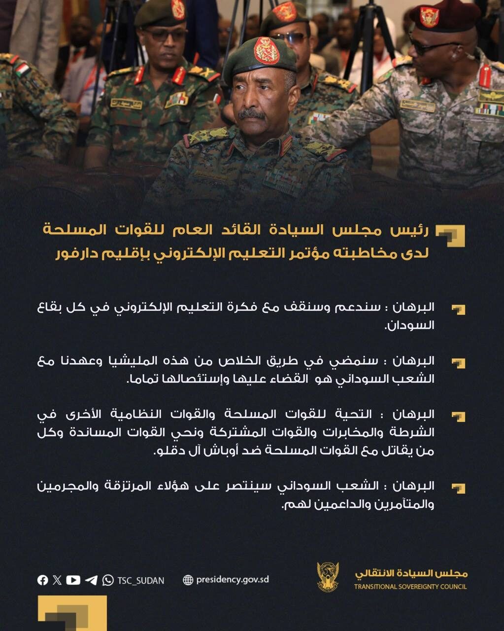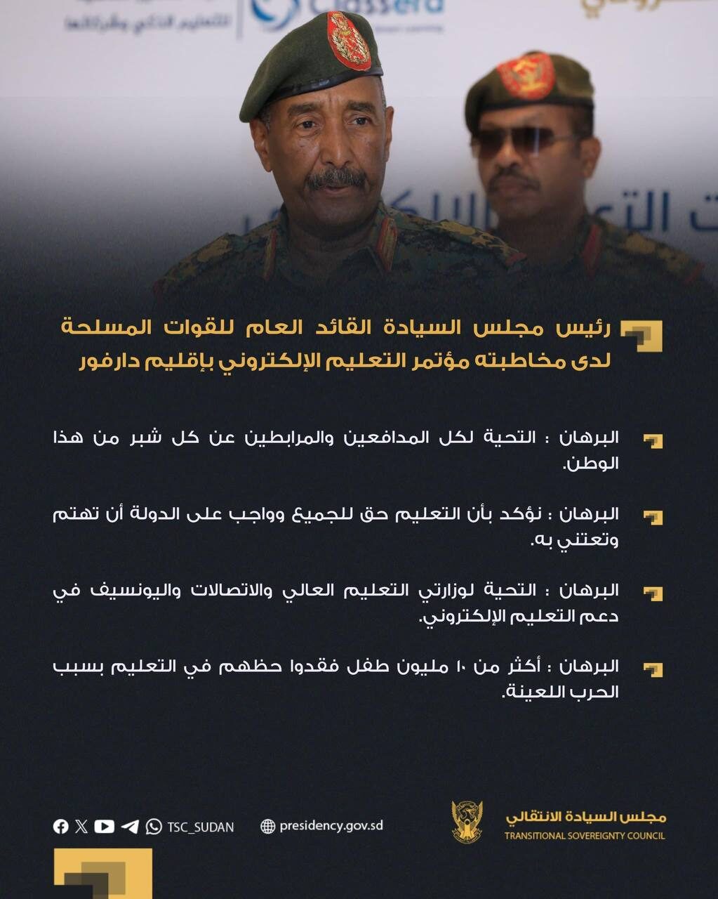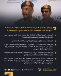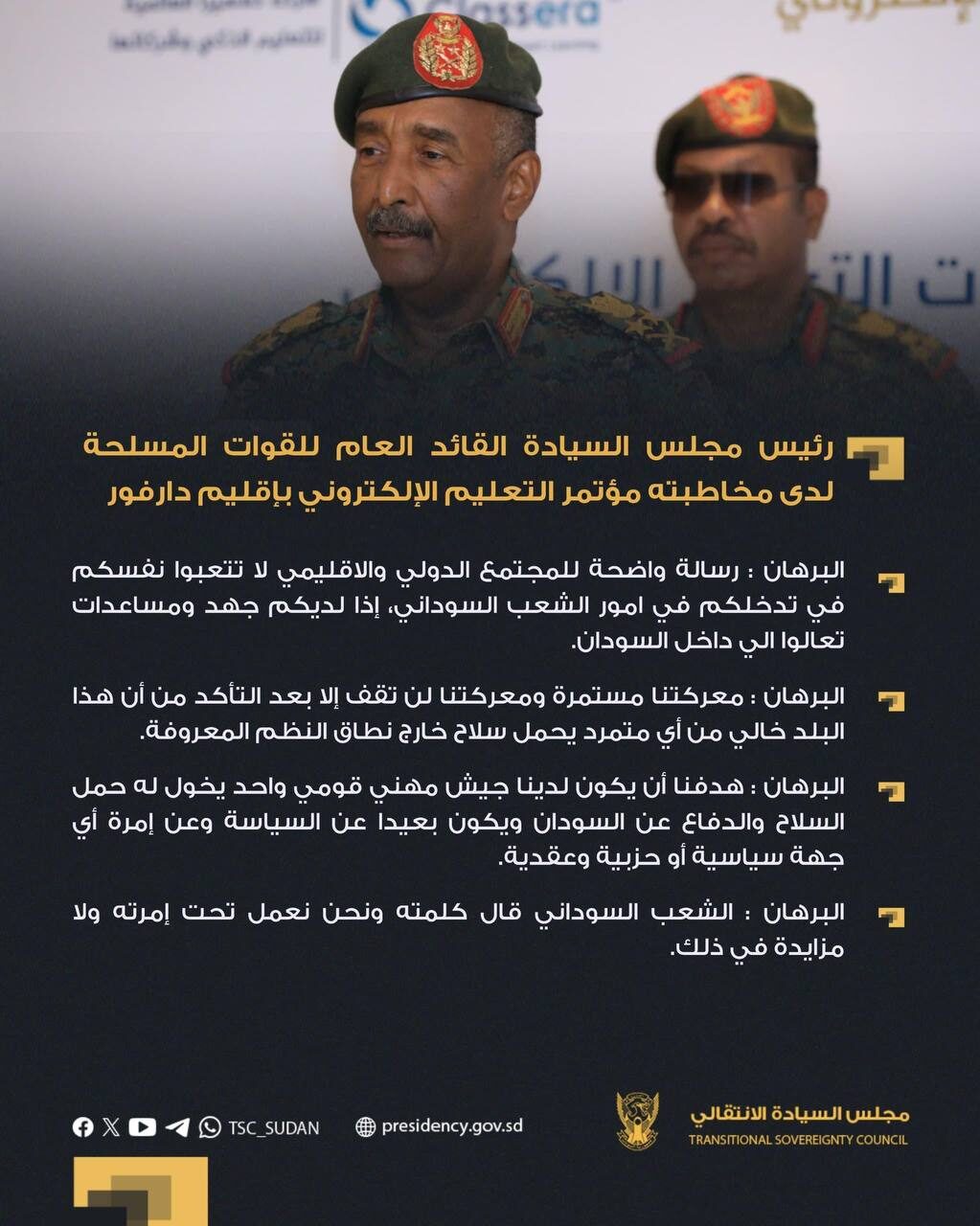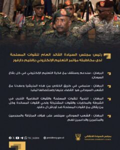 رئيس مجلس السيادة القائد العام للقوات المسلحة لدى مخاطبته مؤتمر التعليم الإلكتروني بإقليم دارفور: