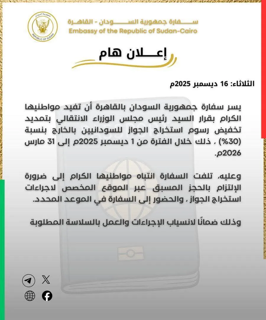 📣 إعلان هام من سفارة السودان بالقاهرة: تمديد تخفيض رسوم الجواز للمغتربين حتى مارس 2026