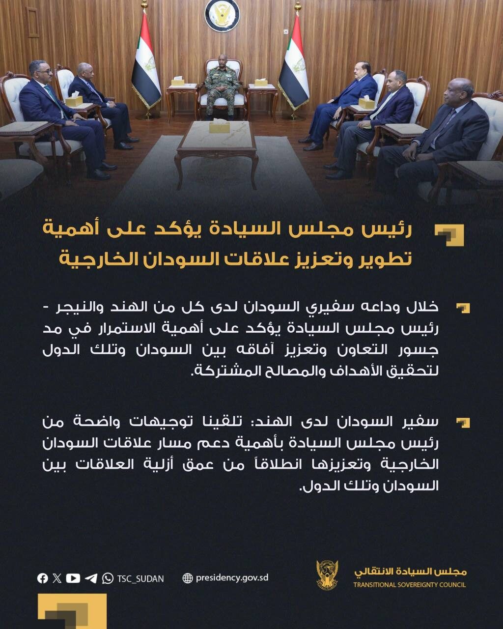 أكد السيد رئيس مجلس السيادة القائد العام للقوات المسلحة، الفريق أول الركن عبدالفتاح البرهان على أهمية تطوير وتعزيز علاقات السودان الخارجية ودفعها ودعم كافة الجهود الرامية لتعزيز مسار تلك العلاقات بما يحقق المصالح العليا للسودان.