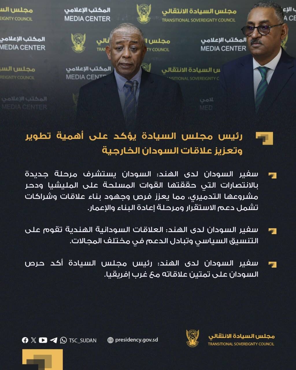 وقال سفير السودان لدى الهند السفير محمد عبدالله التوم في تصريح صحفي ” تلقينا توجيهات واضحة من رئيس مجلس السيادة بأهمية دعم مسار علاقات السودان الخارجية وتعزيزها انطلاقاً من عمق أزلية العلاقات بين السودان وتلك الدول.