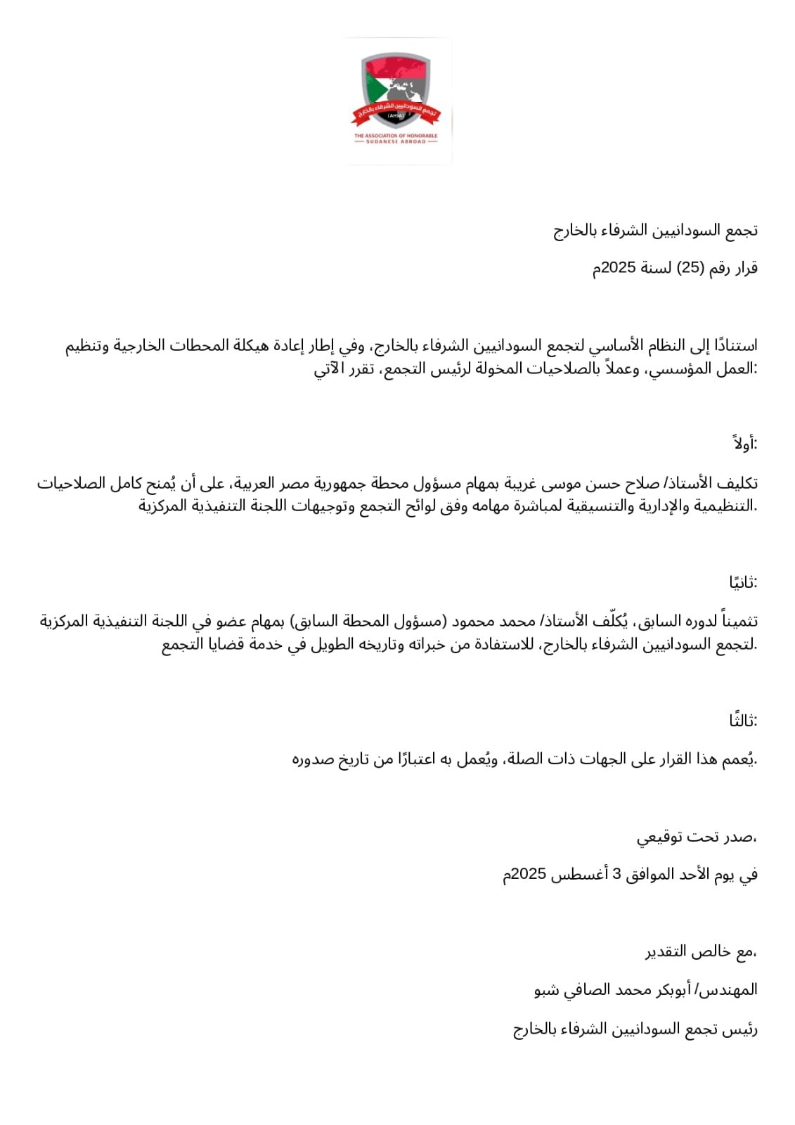 أصدر تجمع السودانيين الشرفاء بالخارج قرارًا إداريًا لإعادة هيكلة المحطات الخارجية، يهدف إلى تعزيز العمل المؤسسي وتنظيم الجهود على الصعيد الدولي. وقد حمل القرار رقم (25) لسنة 2025م، وصدر بتاريخ الأحد 3 أغسطس 2025م، بتوقيع رئيس التجمع، المهندس أبو بكر محمد الصافي شبو.بموجب هذا القرار، تم تكليف المهندس صلاح حسن موسى غريبة بمهام مسؤول محطة جمهورية مصر العربية. وقد تم منحه كامل الصلاحيات التنظيمية والإدارية والتنسيقية لمباشرة مهامه، بما يتماشى مع لوائح التجمع وتوجيهات اللجنة التنفيذية المركزية.