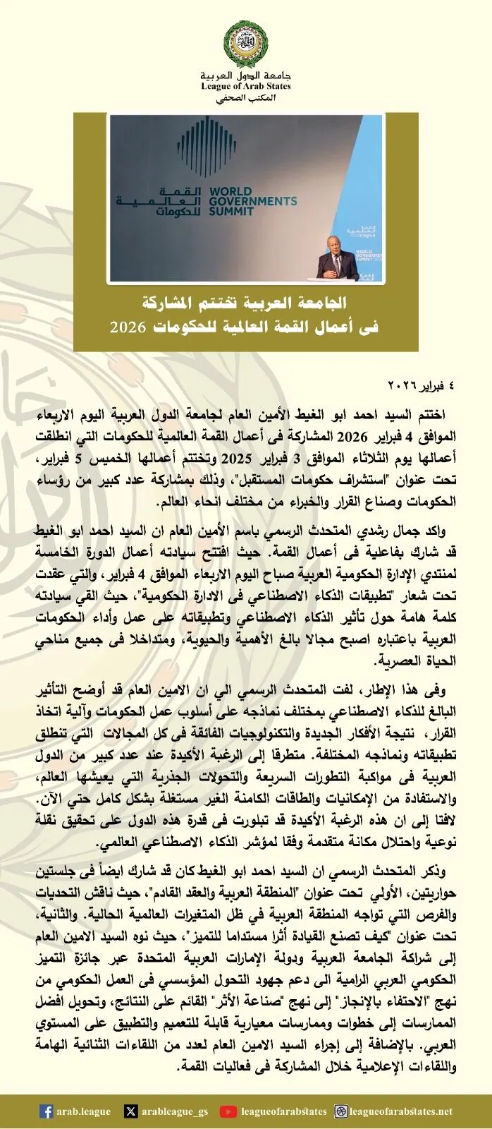أبو الغيط يختتم مشاركته في أعمال القمة العالمية للحكومات 2026