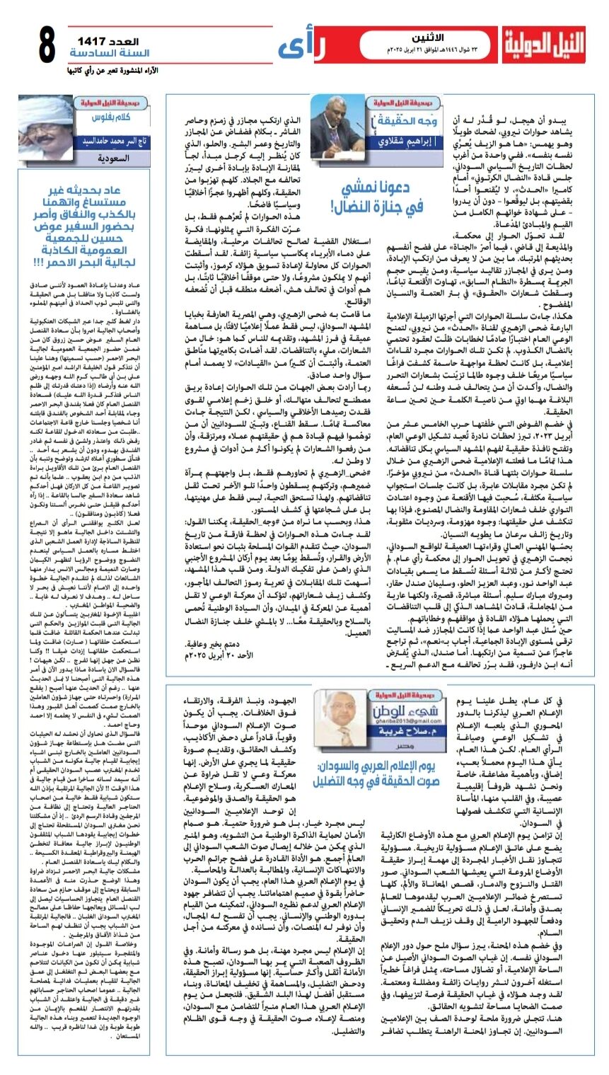 في يوم الإعلام العربي هذا العام، يجب أن يكون السودان حاضراً بقوة في صميم اهتماماتنا. يجب أن تتضافر جهود الإعلام العربي لدعم نظيره السوداني، لتمكينه من القيام بدوره الوطني والإنساني. يجب أن تفسح له المجال، وأن نوفر له المنصات، وأن نسانده في معركته من أجل الحقيقة.