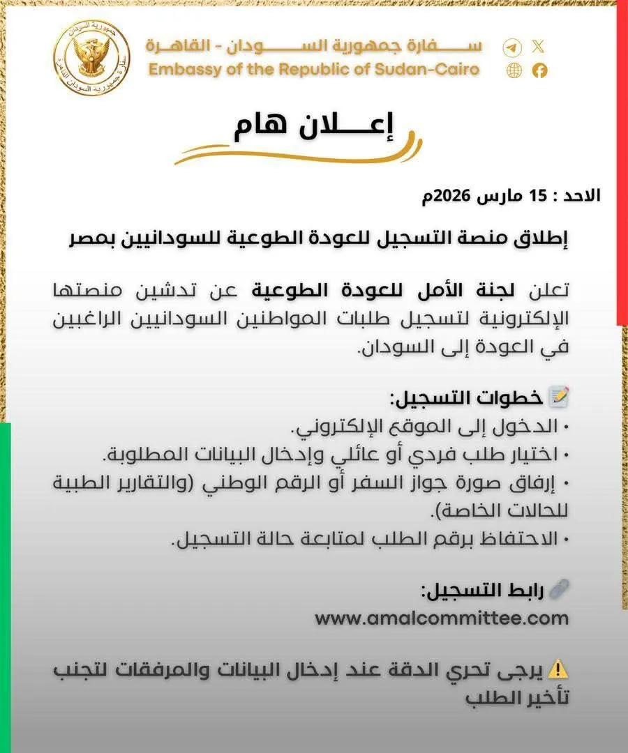 في خطوة تهدف إلى ميكنة وتنظيم ملف العودة إلى أرض الوطن، أعلنت “لجنة الأمل للعودة الطوعية” رسمياً عن تدشين منصتها الإلكترونية المخصصة لاستقبال طلبات المواطنين السودانيين المقيمين بجمهورية مصر العربية الراغبين في العودة. يأتي هذا الإطلاق تنفيذاً لوعود السفير عماد عدوي، سفير السودان بالقاهرة، بتسهيل الإجراءات عبر التحول الرقمي وضمان انسيابية عمليات التفويج.