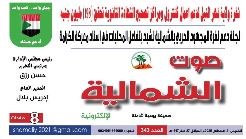 لتصفح صحيفة صوت الشمالية العدد 343 الصادر يوم الخميس 21 أغسطس 2025، مستخدما تطبيق Google drive، أضغط هنا ……!!