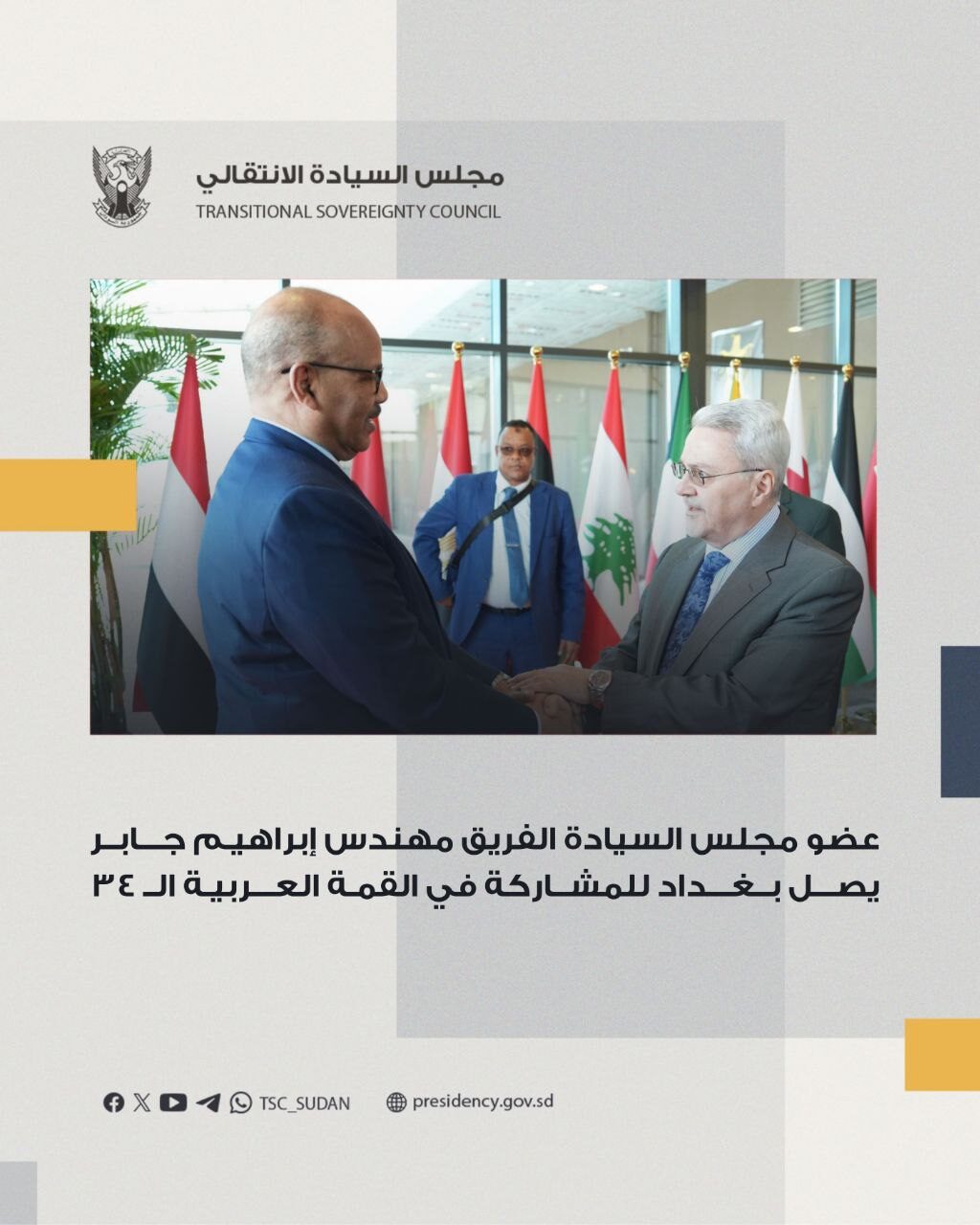وصل عضو مجلس السيادة مساعد القائد العام الفريق مهندس إبراهيم جابر إبراهيم اليوم، إلى العاصمة العراقية بغداد، للمشاركة في أعمال القمة العربية العادية الـ34، والتي تنطلق أعمالها يوم غد السبت.