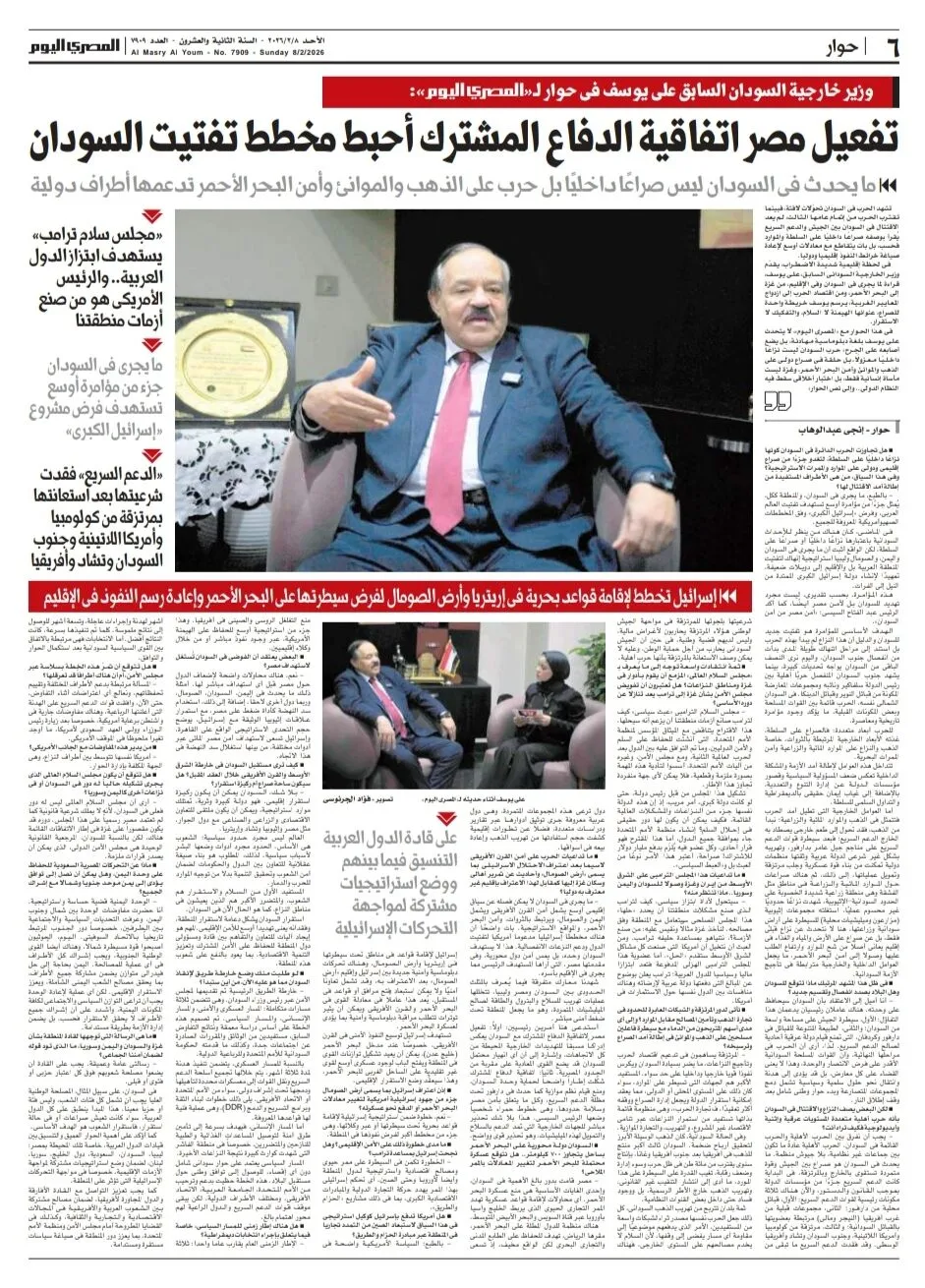 وزير خارجية السودان السابق علي يوسف في حوار لـ«المصري اليوم»: تفعيل مصر اتفاقية الدفاع المشترك أحبط مخطط تفتيت السودان
