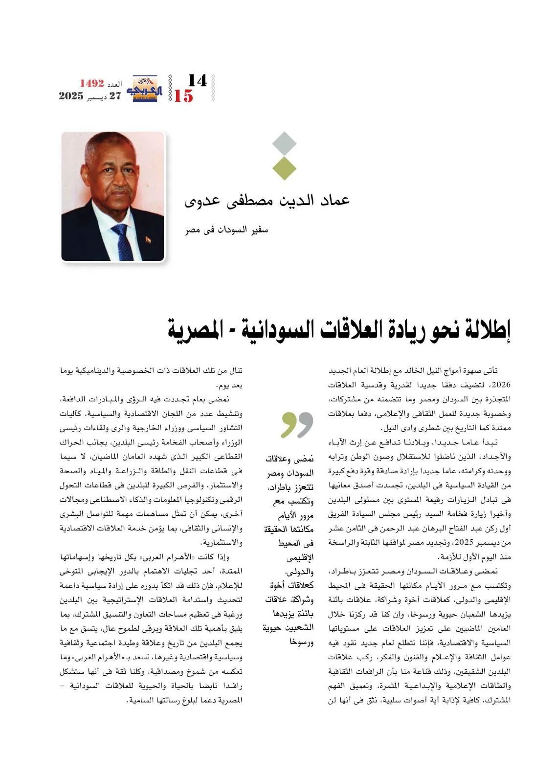 نبدأ عاما جديدا، وبلادنا تدافع عن إرث الآباء والأجداد، الذين ناضلوا للاستقلال وصون الوطن وترابه ووحدته وكرامته، عاما جديدا بإرادة صادقة وقوة دفع كبيرة من القيادة السياسية فى البلدين، تجسدت أصدق معانيها فى تبادل الزيارات رفيعة المستوى بين مسئولى البلدين وأخيرا زيارة فخامة السيد رئيس مجلس السيادة الفريق أول ركن عبد الفتاح البرهان عبد الرحمن فى الثامن عشر من ديسمبر 2025، وتجديد مصر لمواقفها الثابتة والراسخة منذ اليوم الأول للأزمة.